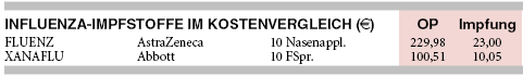KOSTEN: Die einmalige Impfung mit dem attenuierten Nasalimpfstoff FLUENZ kostet 23 € und damit mehr als das Doppelte eines günstigen inaktiven Influenzaimpfstoffes (z.B. XANAFLU: 10 €; Basis: Listenpreise).