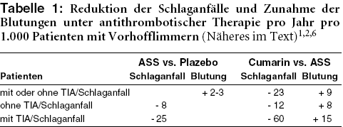 Cumarin-Antikoagulanzien (INR 2-3) sind ASS (75-325 mg/Tag) in dieser Indikation überlegen: Bei Patienten mit nichtvalvulärem Vorhofflimmern ohne TIA oder Insult in der Anamnese reduzieren sie Insulte jeder Ätiologie im Vergleich zu ASS signifikant um 32% und systemische Embolien um 52%. Hirnblutungen und schwere extrakranielle Blutungen sind allerdings fast doppelt so häufig.5 Pro 1.000 Patienten treten unter oraler Antikoagulation pro Jahr 12 ischämische Insulte weniger, aber 8 schwere Blutungen mehr auf als unter ASS.6 Bei Patienten mit oder ohne TIA oder Insult vermindern Cumarine im Vergleich zu Thrombozytenaggregationshemmern Insulte jeder Genese um 38% bis 52%. Schwere extrakranielle Blutungen nehmen jedoch um 42% bis 71% zu.1,2,6 Pro 1.000 Patienten treten unter Cumarinen in diesem Kollektiv jährlich 23 ischämische Insulte weniger und 9 schwere Blutungen mehr auf. Werden nur Patienten mit TIA oder Insult betrachtet, stehen 60 verhinderten Insulten 15 zusätzliche schwere Blutungen gegenüber.6