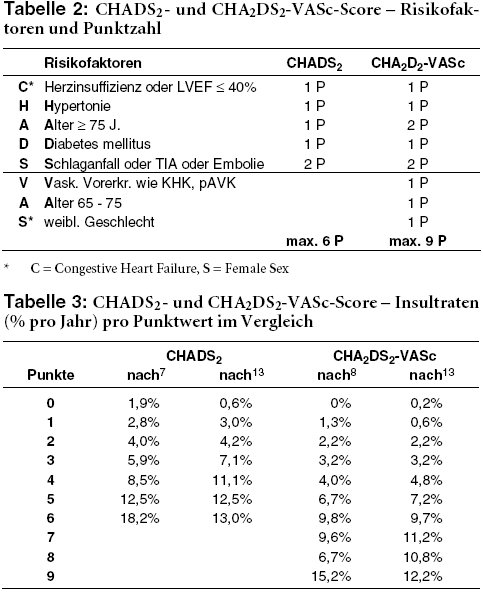 CHADS2-Score, CHA2DS2-VASc-Score: Scores zur Einschätzung des Insultrisikos bei Vorhofflimmern, siehe Tabelle 2. |