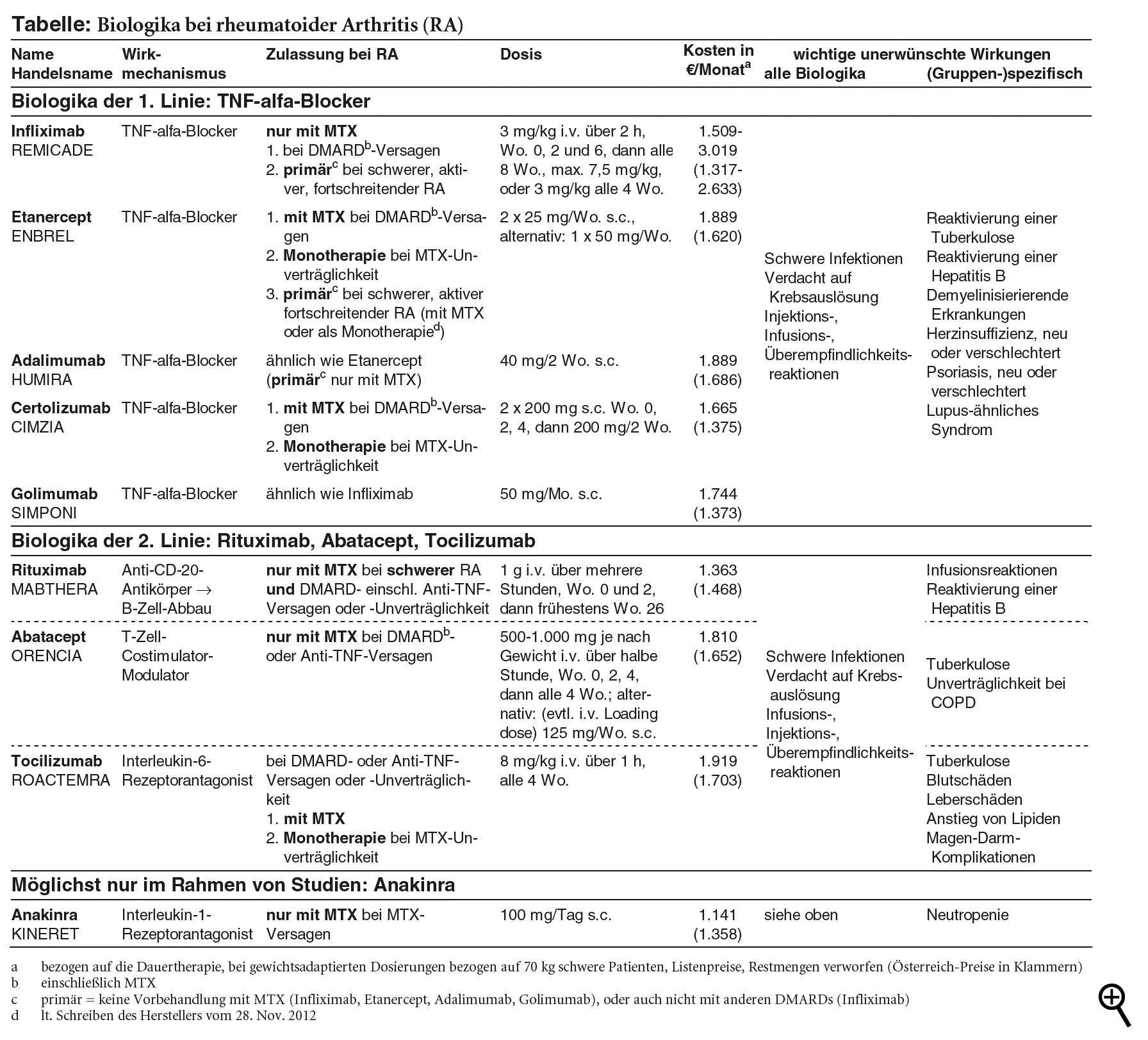 Die vor gut zehn Jahren erstmals in Deutschland eingeführten Tumornekrosefaktor (TNF)-alfa-Hemmstoffe wie Infliximab (REMICADE) oder Etanercept (ENBREL; a-t 2000; 31: 26-7) und andere Biologika wie Rituximab (MABTHERA) haben zu den Veränderungen in der Therapie der rheumatoiden Arthritis beigetragen. Sie haben heute einen allgemein anerkannten Stellenwert als Reservemittel. Insgesamt sind fünf TNF-alfa-Hemmstoffe zur Behandlung der rheumatoiden Arthritis zugelassen, neben Infliximab und Etanercept Adalimumab (HUMIRA; a-t 2003; 34: 91-2), Certolizumab (CIMZIA) und Golimumab (SIMPONI). Sie unterscheiden sich in Dosis, Applikationsart und -intervall sowie in der exakten Formulierung des Anwendungsgebietes. Darüber hinaus werden vier weitere anders wirkende Biologika gegen die rheumatoide Arthritis angeboten: der Interleukin-1-Rezeptorantagonist Anakinra (KINERET; a-t 2002; 33: 49-50), der T-Zell-Costimulator-Modulator Abatacept (ORENCIA), der Anti-CD20-Antikörper Rituximab und der Interleukin-6-Rezeptorantagonist Tocilizumab (ROACTEMRA; siehe Tabelle).