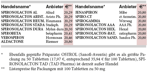 Das Zentrallaboratorium Deutscher Apotheker hat in einer Reihenuntersuchung 17 Fertigarzneimittel mit 50 mg Spironolakton (ALDACTONE, Generika) überprüft. Alle Präparate erfüllen die Anforderungen nach amerikanischem (USP 34) bzw. europäischem Arzneibuch (Ph. Eur. 7.0) hinsichtlich Gleichförmigkeit der Masse, In-vitro-Freisetzung, Wirkstoffgehalt und Teilbarkeit von Präparaten, in deren Gebrauchsinformation explizit auf diese Möglichkeit hingewiesen wird. Die Autoren gehen von hoher pharmazeutischer Qualität und Vergleichbarkeit aus (KAUNZINGER, A. et al.: Pharm. Ztg. 2013; 158: 460-4). Nachstehend vergleichen wir die Listenpreise der geprüften Präparate auf der Basis von Packungen mit 100 Tabletten zu 50 mg (Festbetrag: 20,80 €). Die Preisunterschiede sind gering: