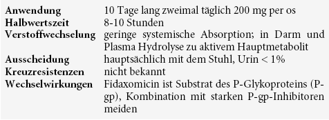 ∎  Das Makrozyklin-Antibiotikum Fidaxomicin (DIFICLIR) wird seit Januar 2013 für die Behandlung der Clostridium-difficile-assoziierten Diarrhö angeboten.