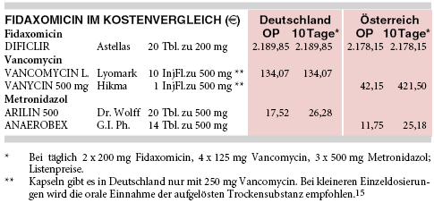 KOSTEN: Die zehntägige Behandlung mit Fidaxomicin kostet für 400 mg/Tag 2.190 € und damit 16- bzw. 83-mal mehr als die Behandlung mit Vancomycin (VANCOMYCIN LYOMARK; 134 € bei 10 Tagen täglich 500 mg) bzw. Metronidazol (ARILIN; 26 € bei 10 Tagen täglich 1.500 mg).