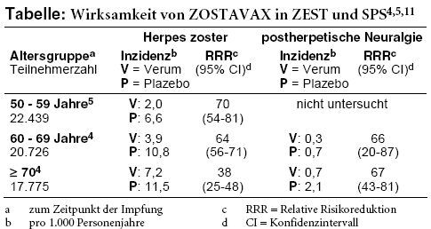 ZOSTAVAX ist als Einmalimpfung zugelassen zur Prävention von Herpes zoster und postherpetischer Neuralgie bei Personen ab 50 Jahren.3 2009 fehlten Wirksamkeitsdaten für die Gruppe der 50- bis 59-Jährigen. Bei Personen ab 60 Jahren senkt die Vakzine innerhalb von drei Jahren in der für die Zulassung maßgeblichen Shingles Prevention Study (SPS)4 die Häufigkeit eines Herpes zoster von 3,3% auf 1,6% und die Rate postherpetischer Neuralgien von 0,42% auf 0,14% gegenüber Plazebo (a-t 2009; 40: 96-7).