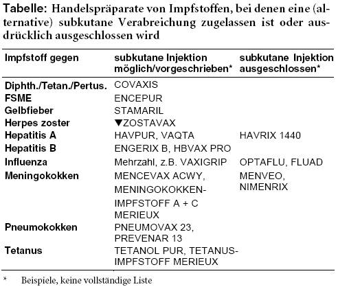 Mit einer Ausnahme, dem Tollwutimpfstoff (RABIPUR u.a.), gibt es von den Impfstoffen, die für die meist älteren antikoagulierten Patienten relevant sind, jeweils mindestens ein Handelspräparat, das die subkutane Injektion erlaubt, die in diesem Fall gewählt werden sollte.