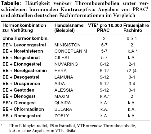 Da die Häufigkeitsangaben des PRAC zum VTE-Risiko etwa dreifach höher liegen als in den entsprechenden Passagen der aktuellen deutschen Fachinformationen (siehe Tabelle) und kombinierte hormonale Kontrazeptiva breit verordnet werden, bekommen die „kleinen Unterschiede” eine große Relevanz: 2012 verhüteten beispielsweise mindestens 550.000 Frauen mit Drospirenon-haltigen Pillen. Den Risikodaten des PRAC zufolge dürften darunter in Deutschland pro Jahr 250 Frauen mehr eine VTE erlitten haben, als wenn alle stattdessen ein Levonorgestrel-haltiges Kontrazeptivum eingenommen hätten.