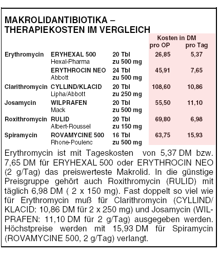 therapeutischen Vorteil, ist aber fast doppelt so teuer wie Erythromycin (vgl. Kasten).11
