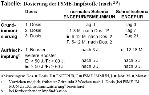 AKTIVE IMMUNISIERUNG: Derzeit sind international vier Impfstoffe gegen FSME im Handel, von denen zwei (ENCEPUR, FSME-IMMUN) den europäischen Virustyp enthalten und zwei (ENCEVIR, TBE-MOSCOW [Russland u.a.]) den fernöstlichen Subtyp. Alle basieren auf inaktivierten, auf Zellkulturen gezüchteten Viren, die an Aluminiumhydroxid als Wirkverstärker adsorbiert sind.1 FSME-IMMUN wurde erstmals 1976 in Österreich zugelassen und ist hierzulande seit 1982 auf dem Markt. Der ENCEPUR-Vorläufer FSME-VACCINE BEHRING wurde 1991 in Deutschland eingeführt. In den derzeit angebotenen Formulierungen sind ENCEPUR ERWACHSENE bzw. KINDER und FSME-IMMUN ERWACHSENE hierzulande seit 2002 erhältlich und FSME-IMMUN JUNIOR seit 2003. Die Grundimmunisierung besteht aus drei Injektionen. Danach werden regelmäßige Auffrischimpfungen empfohlen (siehe Tabelle).2-5 Dabei gilt ebenso wie für andere Impfstoffe, dass jede Impfung zählt: Auch eine für viele Jahre unterbrochene Grundimmunisierung oder nicht zeitgerecht durchgeführte Auffrischimpfung muss nicht neu begonnen werden, sondern wird mit den fehlenden Impfstoffdosen komplettiert.6