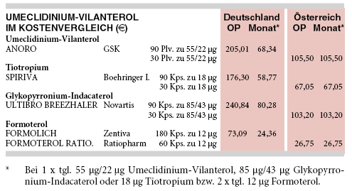 Einmal täglich Umeclidinium-Vilanterol-Inhalat (ANORO) kostet 68 € pro Monat und damit 16% mehr als einmal täglich Tiotropium-Inhalat (SPIRIVA: 59 €), 18% weniger als die Kombination von Tiotropium mit einem günstigen Formoterol-Generikum (zweimal täglich 12 µg mit FORMOLICH: 24 €) und 15% weniger als die Glykopyrronium-Indacaterol-Kombination ULTIBRO BREEZHALER (80 €).