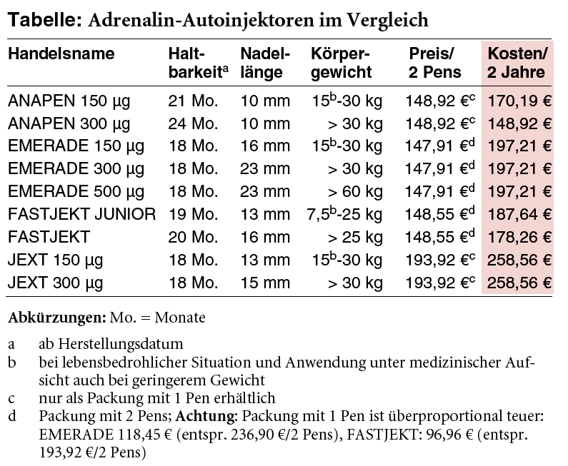 Ende Juni informiert Bausch + Lomb über Blockaden, die „in sehr seltenen Fällen“ während der Stabilitätsprüfung des Adrenalin-Autoinjektors EMERADE aufgetreten sind.1 Zugelassen ist der Autoinjektor zur Notfallbehandlung schwerer akuter allergischer Reaktionen. Bleibt nach der ersten Injektion eine klinische Besserung aus, kann mit einem zweiten Pen eine weitere Dosis 5 bis 15 Minuten nach der ersten injiziert werden. In der Fachinformation wird empfohlen, Patienten zwei Autoinjektoren zu verschreiben, die diese zu jeder Zeit bei sich tragen sollten.2 Aufgrund der festgestellten Probleme ist es nun „zwingend erforderlich“, zwei Fertigpens mitzuführen.1 Angesichts einer nicht auszuschließenden Blockade sowie einer ggf. notwendigen zweiten Injektion stellt sich die Frage, ob nun nicht sogar drei Pens erforderlich wären. Allerdings sollte – auch angesichts der hohen Kosten der Autoinjektoren – von den Anbietern zu erwarten sein, dass diese zuverlässig auslösende Ware garantieren. Probleme mit Adrenalin-Autoinjektoren sind jedoch nicht neu. Alle drei Mitbewerber haben in den vergangenen Jahren Injektoren auf Patientenebene wegen möglicher Fehlfunktion zurückgerufen: Lincoln Medical 2012 ANAPEN und ANAPEN JUNIOR (a-t 2012; 43: 62), ALK 2013 mehrere Chargen von JEXT3 und Meda 2017 mehrere Chargen von FASTJEKT und FASTJEKT JUNIOR (a-t 2017; 48: 40).* Die Kosten für zwei Injektoren, die maximal zwei Jahre haltbar sind und deren Haltbarkeitsdauer in der Vergangenheit zum Teil sogar deutlich verringert wurde, liegen – berechnet für einen Zwei-Jahres-Zeitraum – bei mindestens 149 € (siehe Tabelle), viel zu hoch, wie wir finden. Dabei ist die Verzögerung zwischen Herstellung und Abgabe in der Apotheke, die den tatsächlich möglichen Nutzungszeitraum verringert, nicht berücksichtigt, –Red.