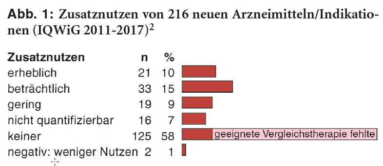 Eine aktuelle Analyse der IQWiG-Beurteilungen der 216 von 2011 bis 2017 bewerteten Arzneimittel (152 neue Wirkstoffe, 64 neue Indikationen) ernüchtert: Nur bei 25% wird ein beträchtlicher oder erheblicher Zusatznutzen festgestellt und bei 16% ein geringer oder nicht quantifizierbarer. Bei rund 40% der Mittel mit Zusatznutzen bezieht sich dieser zudem nur auf Teilbereiche der zugelassenen Indikationen. Zwei Arzneimittel (1%) sind schlechter als Standardbehandlungen. Für mehr als die Hälfte (125; 58%) kann dagegen kein Zusatznutzen attestiert werden. Dies beruht aber lediglich bei 9% der Arzneimittel (n = 19) tatsächlich auf Abgleichen mit einer vom G-BA vorgegebenen zweckmäßigen Vergleichstherapie (s. Abbildung 1). Bei den übrigen Arzneimitteln ohne Zusatznutzen (106; 49%) ist eine Bewertung überhaupt nicht möglich, weil nur Vergleichsstudien mit Plazebo (n = 64) oder Therapien vorlagen, die vom G-BA nicht als geeignet angesehen waren (n = 42).2 Die IQWiG-Bewertungen können somit insgesamt keinen aussagekräftigen Überblick über den möglihen therapeutischen Nutzen der im Rahmen der frühen Nutzenbewertung überprüften neuen Arzneimittel geben.