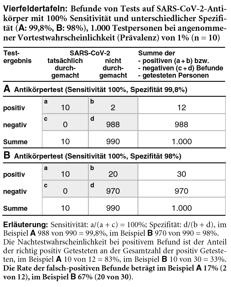 Soll ein Antikörpertest bei Personen ohne typische COVID-19-Symptomatik oder positiven PCR-Test in der Vorgeschichte und ohne bekannte Kontakte zu Infizierten die Frage klären, ob die Infektion womöglich schon (unbemerkt) durchgemacht wurde, ist vor dem Hintergrund der sehr geringen Vortestwahrscheinlichkeit in dieser Gruppe die Rate falsch-positiver Ergebnisse selbst bei Labortests hoch, denen die Hersteller sehr gute Testeigenschaften attestieren, wie dem von Roche (ELECSYS ANTI-SARS-COV-2) oder Siemens (ATELLICA IM SARS-COV-2 TOTAL [COV2T]). Beide Firmen geben für ihre Tests eine Sensitivität von 100% und eine Spezifität von 99,8% an.29,30 Der Test von Roche zeigt auch an einer kleinen Zahl von Seren, die nach Infektion mit endemischen humanen Coronaviren entnommen wurden, keine Kreuzreaktivität.29 Setzt man diese Testeigenschaften voraus und geht von einer Vortestwahrscheinlichkeit von 1% aus, beträgt bei einem positiven Ergebnis die Wahrscheinlichkeit, die Erkrankung tatsächlich durchgemacht zu haben, lediglich 83%, die Wahrscheinlichkeit eines falsch-positiven Befundes liegt somit bei fast 20% (siehe Vierfeldertafel, A).