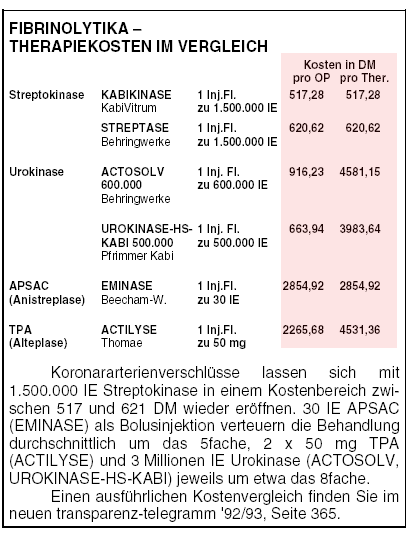 Die Ergebnisse aus ISIS-3 und GISSI-2 scheinen die Anwendung des preiswerteren Fibrinolytikums Streptokinase zu rechtfertigen (Kostenvergleich s. Kasten). Streptokinase wirkt vergleichbar gut wie Urokinase, Anistreplase und TPA und geht dabei mit einem niedrigeren Risiko eines Hirninsultes einher.