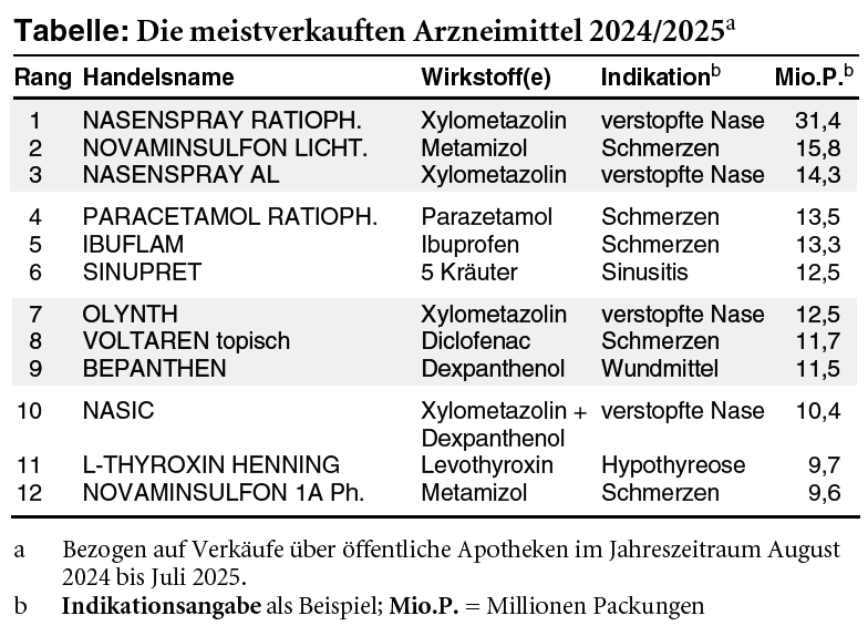 Nach den überwiegend patentgeschützten verschreibungspflichtigen Medikamenten, die am meisten Geld verschlingen (a-t 2025; 56: 62-3), rücken wir jetzt die zwölf Arzneimittel in den Fokus, die in Deutschland mit insgesamt 153 Millionen (Mio.) Packungen von August 2024 bis Juli 2025 am häufigsten in öffentlichen Apotheken verkauft wurden. Elf sind patentfrei und relativ preiswert, auch wenn es zum Teil deutlich günstigere Alternativen gibt.* Mit jeweils vier der zwölf Präparate dominieren symptomlindernd wirkende abschwellende Nasensprays und systemische Analgetika (siehe Tabelle).