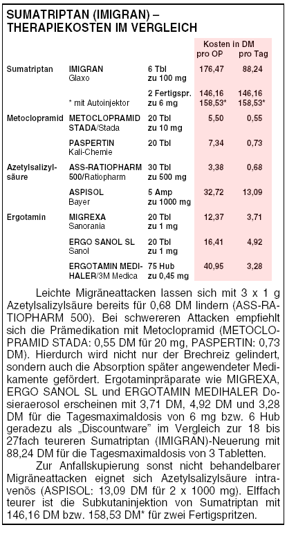 Sumatriptan ist kein Migräneprophylaktikum. Wegen der enormen Kosten von bis zu 150 DM pro Migräneattacke ist die Anwendung nur zu empfehlen,