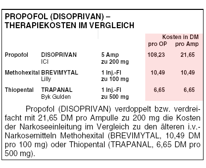 Das zur Einleitung und Aufrechterhaltung der Narkose eingeführte i.v.-Hypnotikum Propofol (DISOPRIVAN) besitzt keine Strukturverwandtschaften mit bewährten Mitteln wie Thiopental (TRAPANAL u.a.). Weil es als Phenolderivat in Wasser nahezu unlöslich ist, wird Propofol in einer Emulsion aus Sojaöl und Eiphosphatid angeboten. Auf eine ältere Formulierung mit dem Hilfsstoff Cremophor EL wurde wegen des erhöhten Risikos pseudoallergischer Reaktionen einschließlich Schock verzichtet. Nach Herstellerangaben ist Propofol "gut steuerbar und zeichnet sich durch geringe Nebenwirkungen aus".1