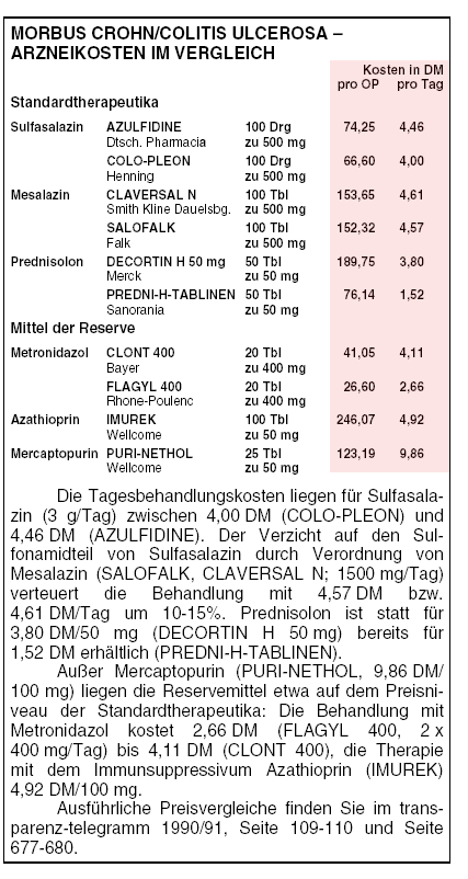 Der Nutzen des Standardtherapeutikums Sulfasalazin (AZULFIDINE, COLO-PLEON) für die Behandlung von Patienten mit Morbus CROHN (s. Tabelle 1) und aktiver Colitis ulcerosa (s. Tabelle 2) sowie zur Verhütung von Rezidiven bei Colitis ulcerosa ist durch klinische Studien belegt. Sind lediglich Abschnitte des Dünndarms betroffen, verspricht dieses Pharmakon weniger Erfolg. Zur Behandlung der auf Rektum und Colon descendens beschränkten Colitis ulcerosa eignen sich besonders Sulfasalazin-Klysmen. Allerdings setzen häufige bzw. schwerwiegende unerwünschte Wirkungen der Anwendbarkeit Grenzen: Methämoglobinbildung, Hämolyse, makrozytäre Anämie, Agranulozytose, Thrombozytopenie, Lungenveränderungen wie fibrosierende Alveolitis und Asthma bronchiale, Neuropathien wie Geschmacksstörungen und Halluzinationen, ferner Hepatitis mit und ohne Cholestase, Beeinträchtigung der männlichen Fertilität u.a.