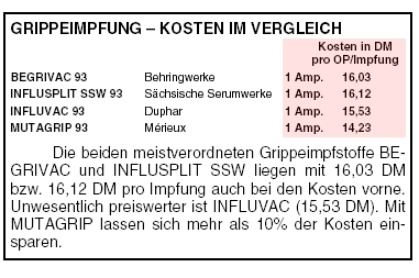 FAZIT: Die Grippeimpfung (BEGRIVAC 93 u.a.) schützt Ältere und Risikopersonen vor Influenza oder mildert zumindest den Verlauf der bisweilen