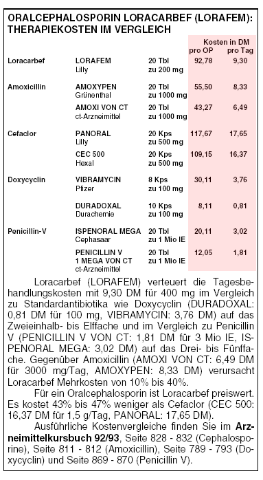 entbehrlich. Dies gilt auch für Loracarbef (LORAFEM) trotz seines im Vergleich zu anderen Cephalosporinen günstigeren Preises.