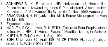 FAZIT: Als "Aufgeregtheit, die ihr Ziel verfehlt" bezeichnete jüngst eine Tageszeitung4 die vom Bundesgesundheitsamt geplante Quarantäne für das Ausgangsmaterial nicht virusabgereicherter Blutprodukte. "Unkoordinierte Hektik" würde die Blutspendedienste "vor unlösbare Aufgaben" stellen. Die angeblich "undurchführbaren Maßnahmen" werden u.W. seit Jahren u.a. vom Bayerischen Roten Kreuz praktiziert, entsprechen dem Stand der medizinischen Erkenntnis und dienen der Minimierung des sogenannten Restrisikos von Blutprodukten, wie sie die höchstrichterliche Rechtsprechung des Bundesgerichtshofs fordert.