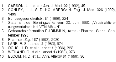 23. Aug. 1991: Wir berichten im arznei-telegramm 8 (1991), 71, daß das Biotest-Inaktivierungsverfahren mittels "Kaltsterilisation" bei mit HIV hochbelastetem Ausgangsmaterial versagt, daß Plasmaspender für das Biotest-Präparat nachträglich als Träger des HI-Virus erkannt worden sind und daß eine Überprüfung des Biotest-Verfahrens zur Keimfreimachung durch das Paul-Ehrlich-Institut ein Überleben von HI-Viren im Plasma trotz Kaltsterilisation zeigt. (Die Untersuchung bleibt auf Druck des Herstellers unveröffentlicht.)