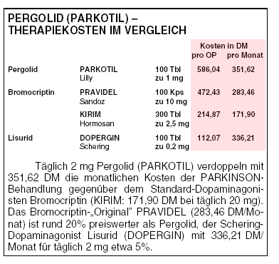 FAZIT: Der dritte Dopaminagonist Pergolid (PARKOTIL) verteuert die Komedikation der PARKINSON-Therapie im Vergleich zu Bromocriptin (KIRIM, PRAVIDEL) und Lisurid (DOPERGIN) bis auf das Doppelte (vgl. Kasten). Im Vergleich zu den anderen Mutterkornderivaten zeichnet sich kein besonderer Nutzen ab.