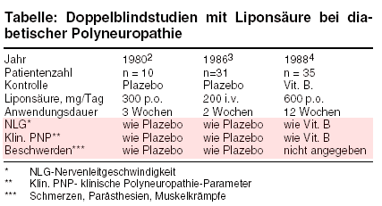 Doppelblindstudien bessert Liponsäure weder per os noch intravenös objektive bzw. klinische Zeichen der diabetischen Polyneuropathie (Nervenleitgeschwindigkeit,