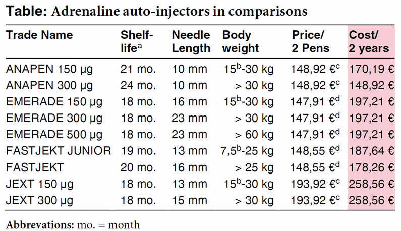 At the end of June, Bausch + Lomb informs about blockage of the EMERADE adrenaline auto-injector which occured "in very rare cases" during stability checks (1). The auto-injector is authorised for the emergency treatment of severe acute allergic reactions. If there is no clinical improvement after the first injection, a second pen can be used to inject a further dose 5 to 15 minutes after the first. The Summary of Product Characteristics (SPC) recommends prescribing patients two auto-injectors that they should carry with them at all times (2). Due to the identified problem it is now "absolutely essential" for patients to carry two pens with them (1). Given that a blockage cannot be ruled out and it may be necessary to administer a second injection, we are now faced with the question whether it would be necessary to prescribe three pens. However, in light of the high costs of the auto-injectors, the providers should be expected to guarantee that these will trigger reliably. Problems with adrenaline auto-injectors are not new. In the past few years, all three competitors have recalled injectors at the patient level for possible malfunctions: Lincoln Medical in 2012 ANAPEN and ANAPEN JUNIOR (a-t 2012; 43: 62), ALK in 2013 several batches of JEXT (3) and Meda in 2017 several batches of FASTJEKT and FASTJEKT JUNIOR (a t 2017; 48: 40).* The costs for two injectors that have a maximal shelf-life of two years and for which the shelf-life has been reduced considerably in some cases in the past are at least EUR 149 calculated over a two-year period (see table), which we think is much too high. The delay between production and dispensing in the pharmacy, which decreases the potential period of use, is not even taken into account,-Ed.