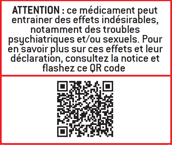In France increasing reference will be made to the risks of finasteride (PROPECIA, generics; a-t 1997; No. 10: 106-7, 1999; No. 2: 22-3 and others) for the treatment of male androgenetic alopecia. Its use is only approved in early stages in men aged between 18 and 41. From 28 April 2023 at the latest, all of the packs must display a warning in a box on the front highlighting the harmful psychiatric and sexual effects of the 5-alpha reductase inhibitor (see a t 2016; 47: 16 and 2018; 49: 71-2) (1). A QR code links to sites for patients, prescribers and pharmacists (2) providing information about the severe harmful effects such as sexual disorders that can last for an indefinite period of time, anxiety, depression and suicidal tendencies, among others. A video aims to improve the reporting of adverse effects. Since we feel that the risk/benefit ratio is negative, we continue to advise against the use of finasteride to treat androgenetic alopecia, -Ed.
