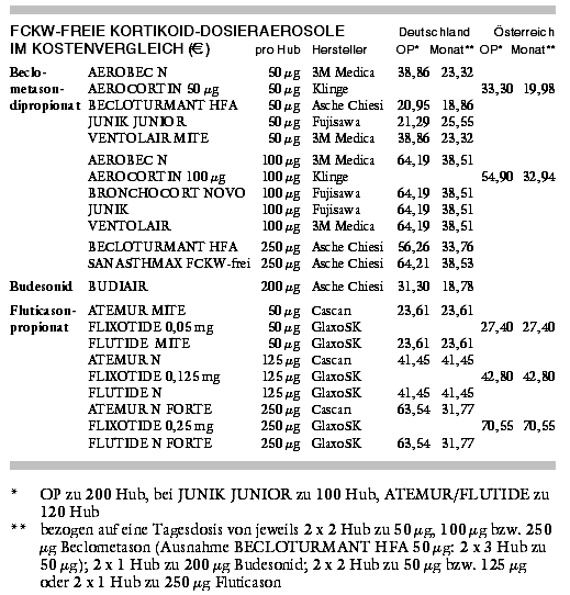 Verwirrung bei. In der Tabelle nennen wir die jetzt angebotenen Norfluran-haltigen Kortikoid-Dosieraerosole und deren Monatskosten.