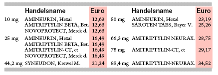Amitriptylin (SAROTEN u.a.)-Präparate im Qualitätsvergleich: Das Zentrallaboratorium Deutscher Apotheker überprüft in einer Reihenuntersuchung die pharmazeutische Qualität von 13 schnell freisetzenden Amitriptylin-Präparaten. Das Ergebnis überzeugt: Alle Proben entsprechen den Vorschriften der Arzneibücher. Der gefundene Wirkstoffgehalt liegt zwischen 93,3% und 98,2% der deklarierten Konzentration (vorgeschrieben sind 90% bis 110%). Die Präparate setzen nach 45 Minuten 93,9% bis 102,7% des Wirkstoffes frei (vorgeschrieben sind mindestens 75% der Deklaration; KAUNZINGER, A. et al.: Pharm. Ztg. 2007; 152: 1988-91). In der Tabelle vergleichen wir die Preise der geprüften Produkte in Packungen mit 100 Tabletten (Wirkstoffmenge als Base deklariert). Das einheitliche Preisniveau fällt auf. Wettbewerb um günstige Preise findet nicht statt: