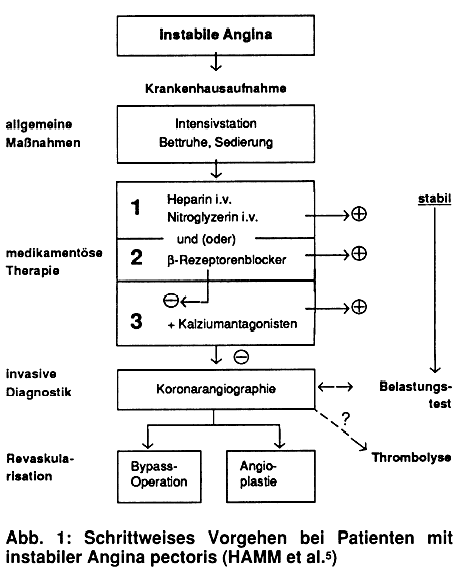 pectoris. Der begründete Verdacht auf instabile Angina erfordert die umgehende Krankenhauseinweisung. Die abgestufte Therapie mit Heparin i.v. (LIQUEMIN