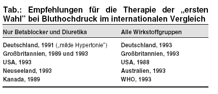1991, in denen nur Betablocker und Diuretika auf der ersten medikamentösen Behandlungsstufe rangieren. In Großbritannien herrscht 1993 unter den
