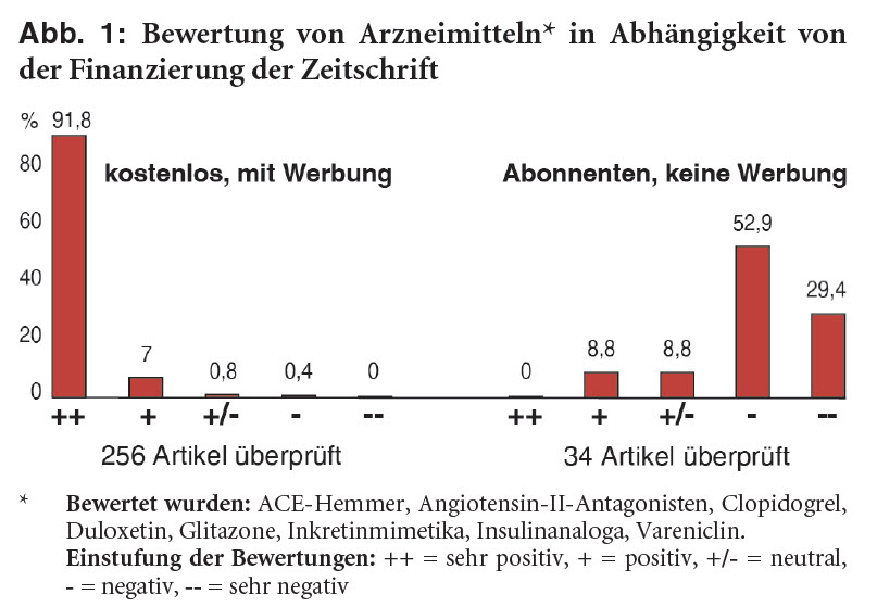 Wie stark der Einfluss von Werbemaßnahmen auf die Bewertung von Arzneimitteln in Zeitschriften sein kann, dokumentiert eine 2011 veröffentlichte Untersuchung von Allgemeinmedizinern: Der zufolge erhalten Leser von Zeitschriften, die vor allem über Werbung finanziert werden wie Ärzte Zeitung, Medical Tribune und Münchener Medizinische Wochenschrift (MMW), fast nur sehr positive (91,8%) oder positive (7%) Bewertungen neuerer viel beworbener Arzneimittel, während die Bewertungen in Fachzeitschriften ohne Werbeeinnahmen wie dem arznei-telegramm® meist gegenteilig ausfallen: 82,3% ablehnend oder sehr ablehnend und je 8,8% neutral oder positiv (s. Abb. 1). Die nachvollziehbare Folgerung der Autoren: Ärzte müssen sich entscheiden zwischen werbefreien Fachzeitschriften mit objektiven Informationen, die allerdings bezahlt werden müssen (a-t ab 64,50 € /Jahr, Studierende ab 41 € /Jahr (Stand Sept. 2024); weitere Informationen siehe Impressum), und kostenlos vertriebenen Periodika mit potenziell verzerrten Informationen (a-t 2011; 42: 39).