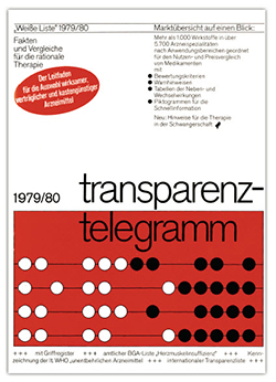Das transparenz-telegramm trug zunächst den Untertitel „Weiße Liste“. Dass der Bundesverband der Pharmazeutischen Industrie bzw. der Verlag der ROTEN LISTE die Bezeichnung höchstwahrscheinlich beanstanden würde, war zu vermuten. Die Frage war nur, wie lange Gegenreaktionen auf sich warten ließen. Schließlich musste 1980, als gerade das transparenz-telegramm 1980/1 in Druck gegangen war, der Untertitel „Weiße Liste“ aus den Druckplatten von Titelseite und Buchrücken entfernt werden. Dies machte sich am fertigen Buch durch eine unschöne Lücke auf dem Buchrücken zwischen dem Schriftzug transparenz-telegramm und der Jahresangabe bemerkbar. |